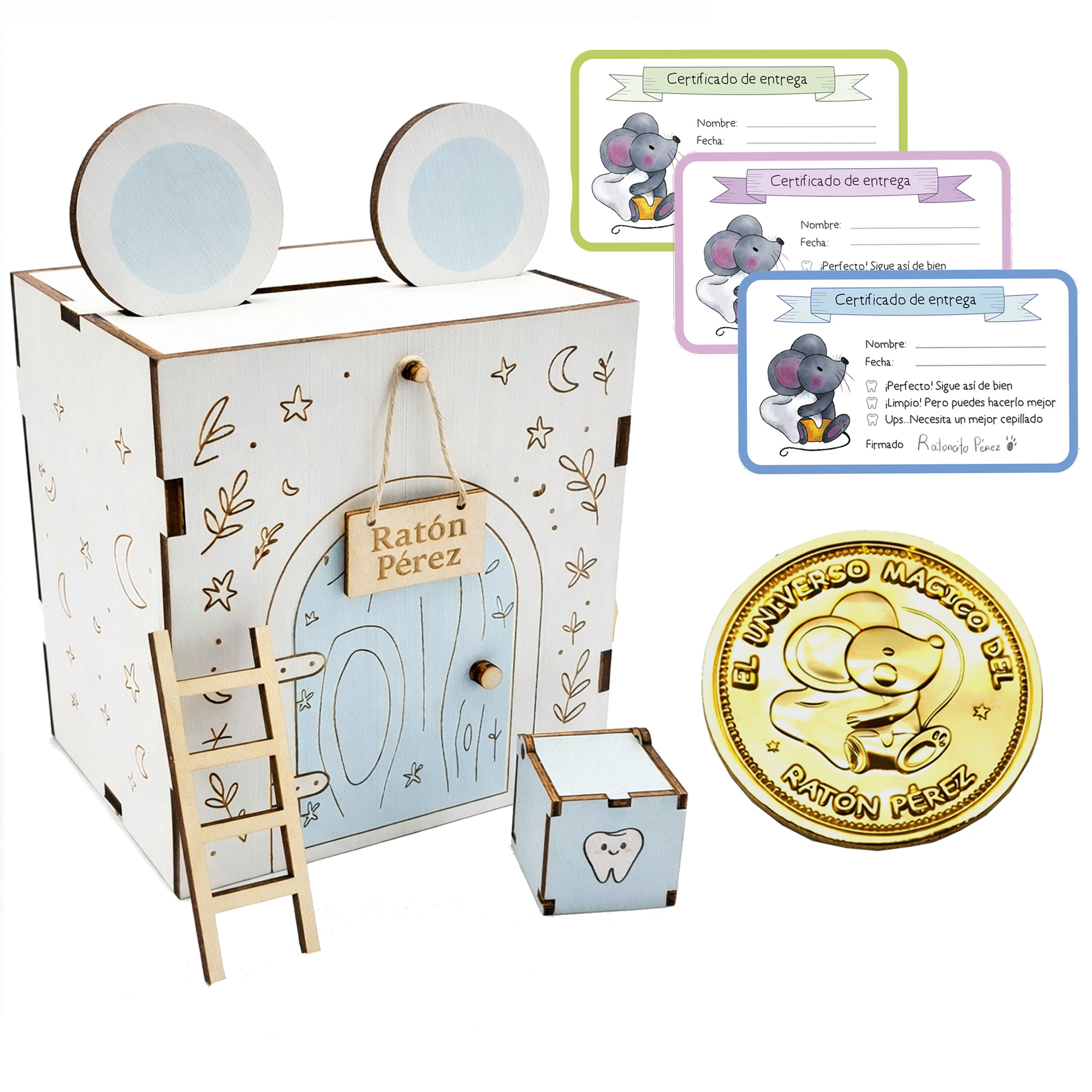 Diseño mágico del Ratón Pérez,Hucha infantil azul con forma de casita, inspirada en el universo del Ratón Pérez, pensada para convertir la caída de cada diente en un recuerdo inolvidable.